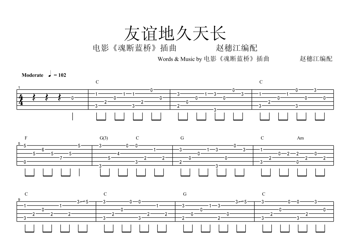 赵穗江《友谊天长地久》吉他谱 - C调独奏六线谱