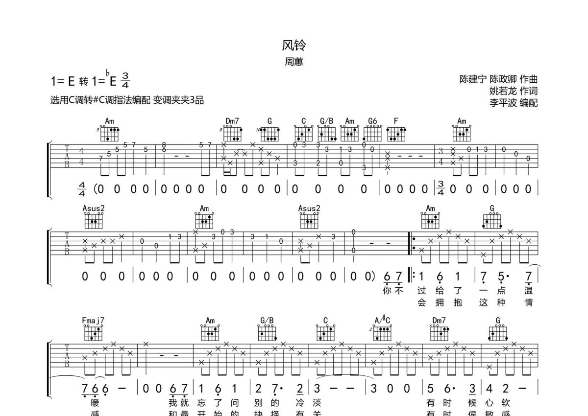 《风铃》是周惠演唱的一首歌曲,本吉他谱采用的是C调指法编配,这份吉他谱共有三张高清图谱,图谱由 @玉帝哥哥 编配上传,图谱使用六线谱编配,包含吉他和弦指法、简谱以及歌词部分,使用这份风铃吉他谱,可以让你更加方便地掌握这首歌曲的弹唱技巧,快来尝试吧。周惠《风铃》吉他谱_C调吉他弹唱谱。