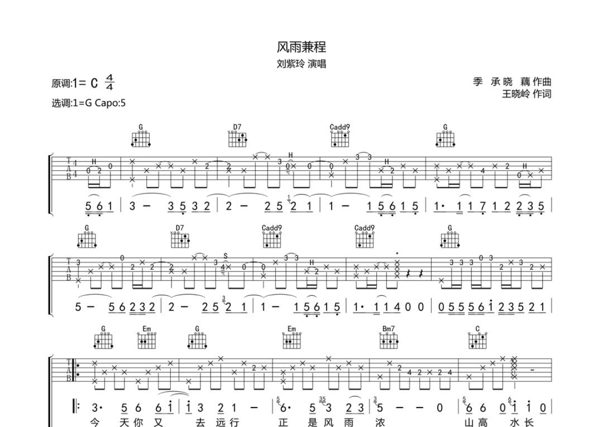 刘紫玲《风雨兼程》吉他谱 - G调弹唱六线谱