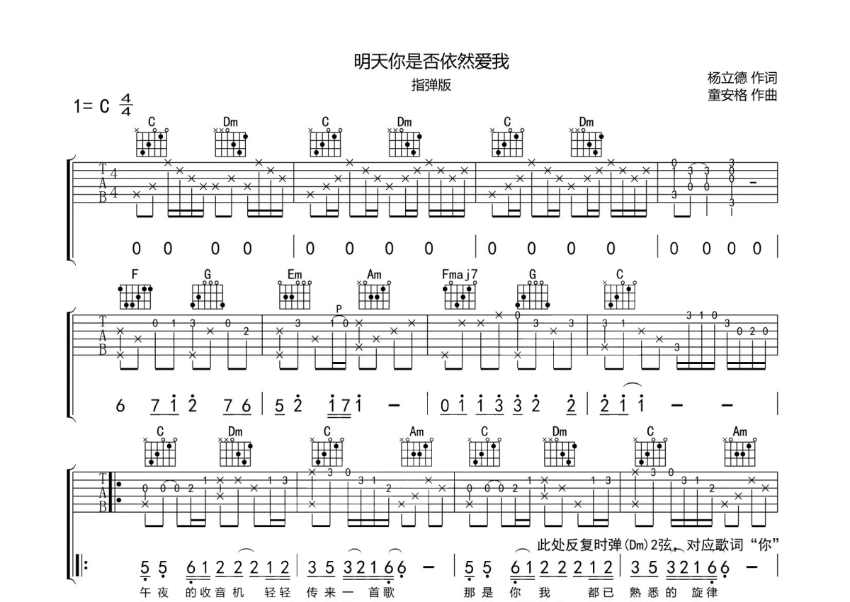 童安格《明天你是否依然爱我》吉他谱 - C调独奏六线谱