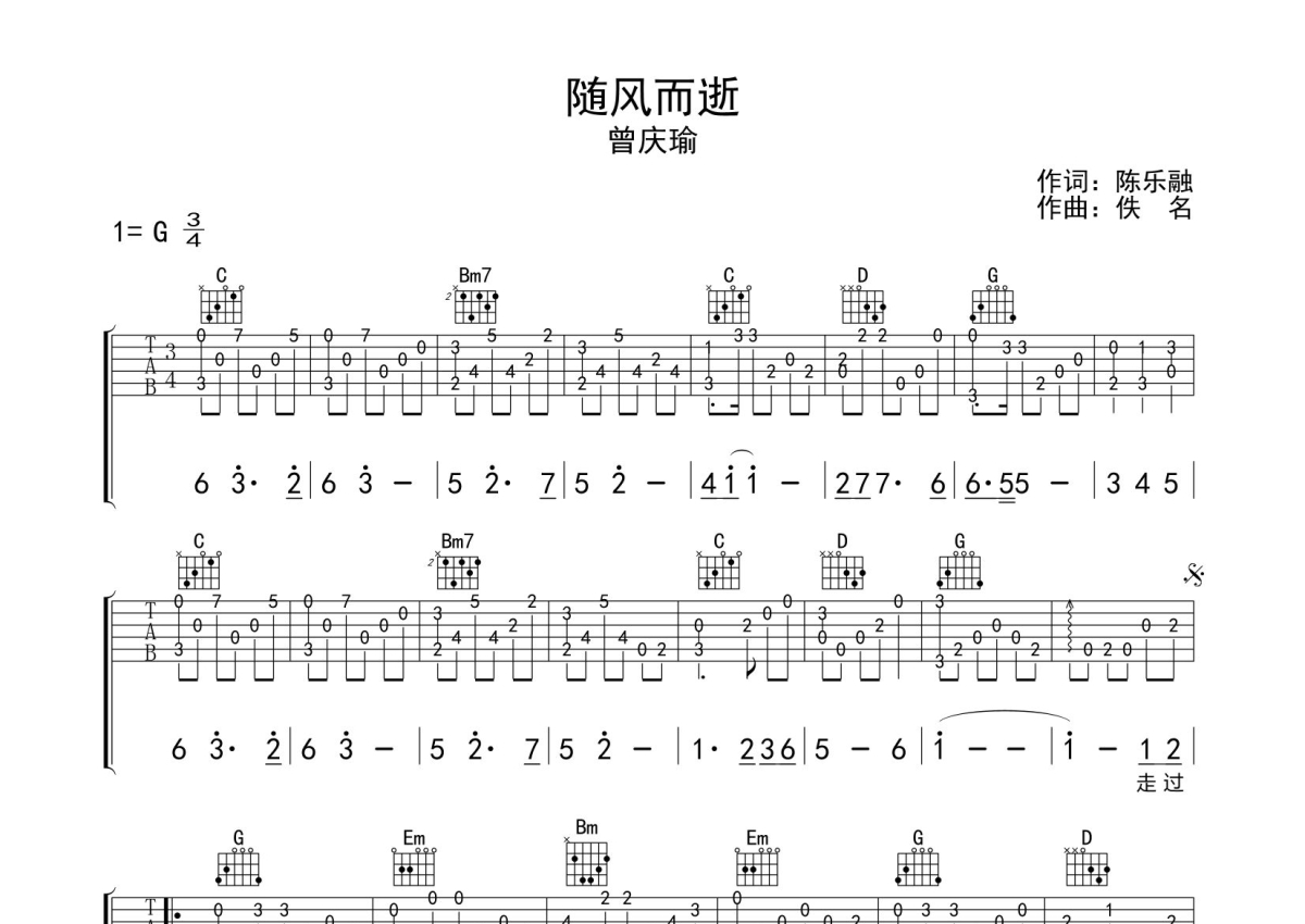 曾庆瑜《随风而逝》吉他谱 - G调独奏六线谱