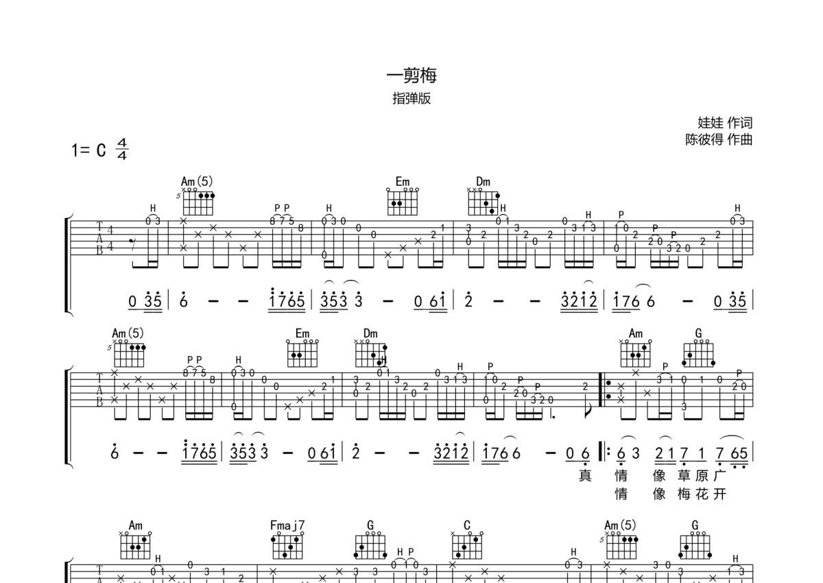 《一剪梅》是费玉清演唱的一首歌曲,本吉他谱采用的是C调指法编配,这份吉他谱共有两张高清图谱,图谱由 @玉帝哥哥 编配上传,图谱使用六线谱编配,使用这份一剪梅吉他谱,可以让你更加方便地掌握这首歌曲的演奏技巧,快来尝试吧。费玉清《一剪梅》吉他谱_C调吉他独奏谱。