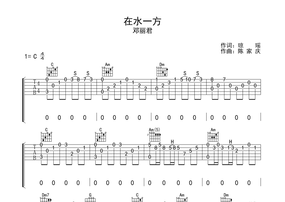 邓丽君《在水一方》吉他谱 - C调独奏六线谱