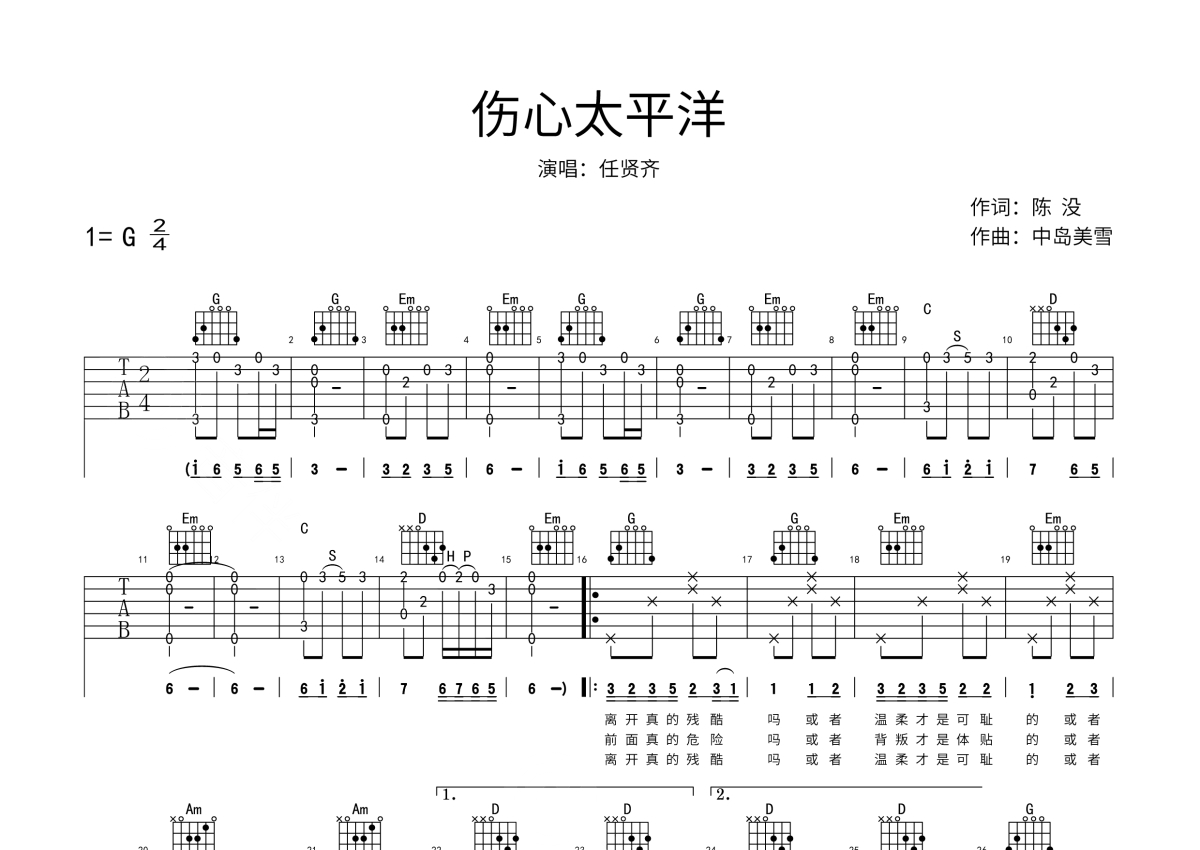 任贤齐《伤心太平洋》吉他谱 - G调弹唱六线谱