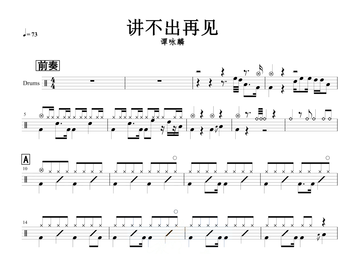 《讲不出再见》是谭咏麟演唱的一首歌曲,这份鼓谱共有三张高清图谱,图谱由 @玉帝哥哥 编配上传,图谱使用五线谱编配,使用这份讲不出再见架子鼓谱,你将能够轻松地敲打出这首谭咏麟的讲不出再见,快来尝试吧。谭咏麟《讲不出再见》鼓谱_架子鼓谱。