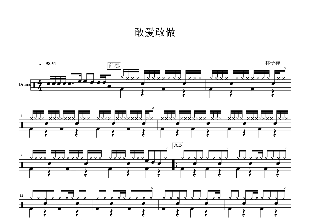 《敢爱敢做》是林子祥演唱的一首歌曲,这份鼓谱共有三张高清图谱,图谱由 @玉帝哥哥 编配上传,图谱使用五线谱编配,使用这份敢爱敢做架子鼓谱,你将能够轻松地敲打出这首林子祥的敢爱敢做,快来尝试吧。《敢爱敢做》是香港著名实力男歌手林子祥(LamTzeCheung)翻唱自Starship的《Nothing’sGonnaStopUsNow》,80年代最经典的粤语歌曲之一。林子祥(GeorgeLam),1947年10月12日出生于中国香港,中国香港男歌手、音乐人、演员。