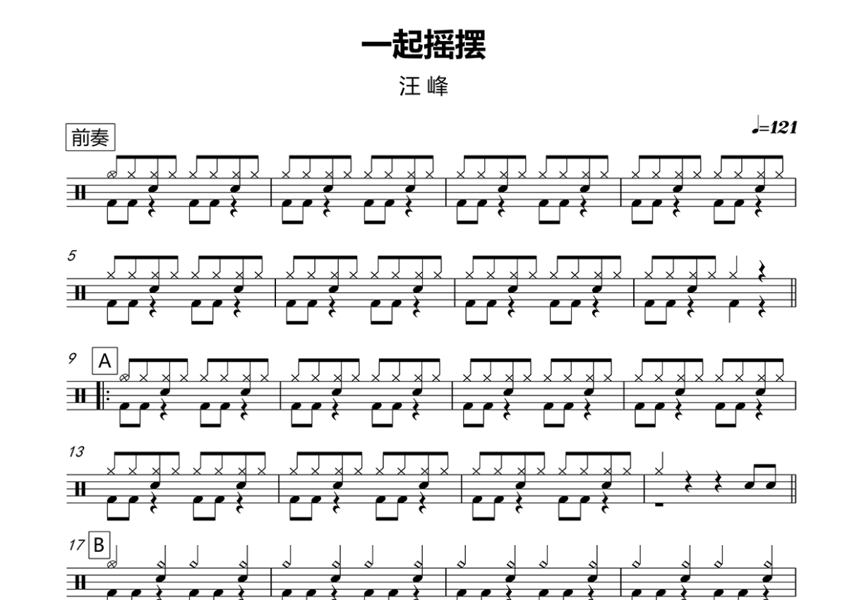 《一起摇摆》是汪峰演唱的一首歌曲,这份鼓谱共有两张高清图谱,图谱由 @玉帝哥哥 编配上传,图谱使用五线谱编配,使用这份一起摇摆架子鼓谱,你将能够轻松地敲打出这首汪峰的一起摇摆,快来尝试吧。《一起摇摆》是由汪峰作词作曲并演唱的一首歌曲,收录于汪峰2013年发行的专辑《生来彷徨》。