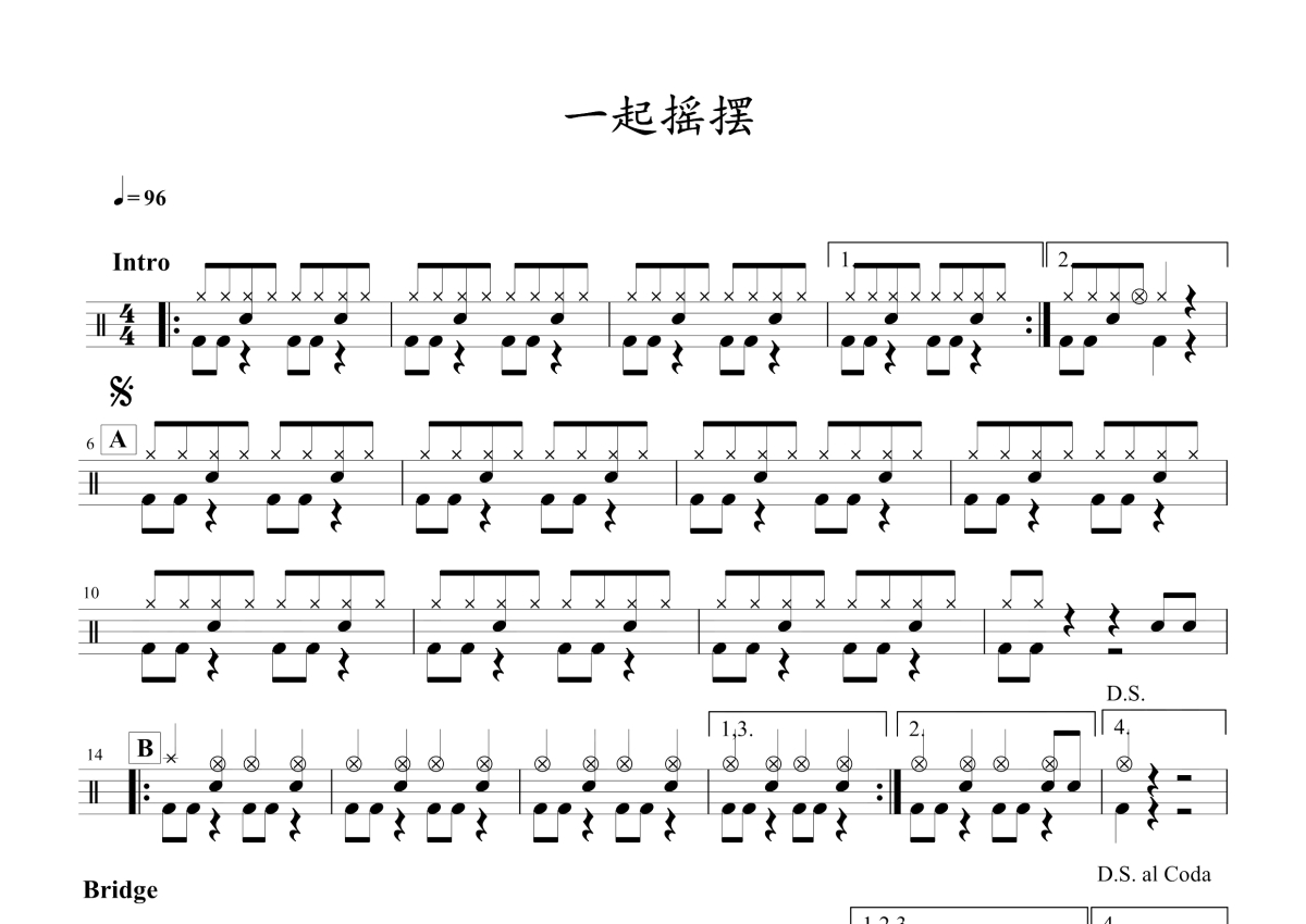 《一起摇摆》是汪峰演唱的一首歌曲,这份鼓谱共有一张高清图谱,图谱由 @玉帝哥哥 编配上传,图谱使用五线谱编配,使用这份一起摇摆架子鼓谱,你将能够轻松地敲打出这首汪峰的一起摇摆,快来尝试吧。《一起摇摆》是由汪峰作词作曲并演唱的一首歌曲,收录于汪峰2013年发行的专辑《生来彷徨》。