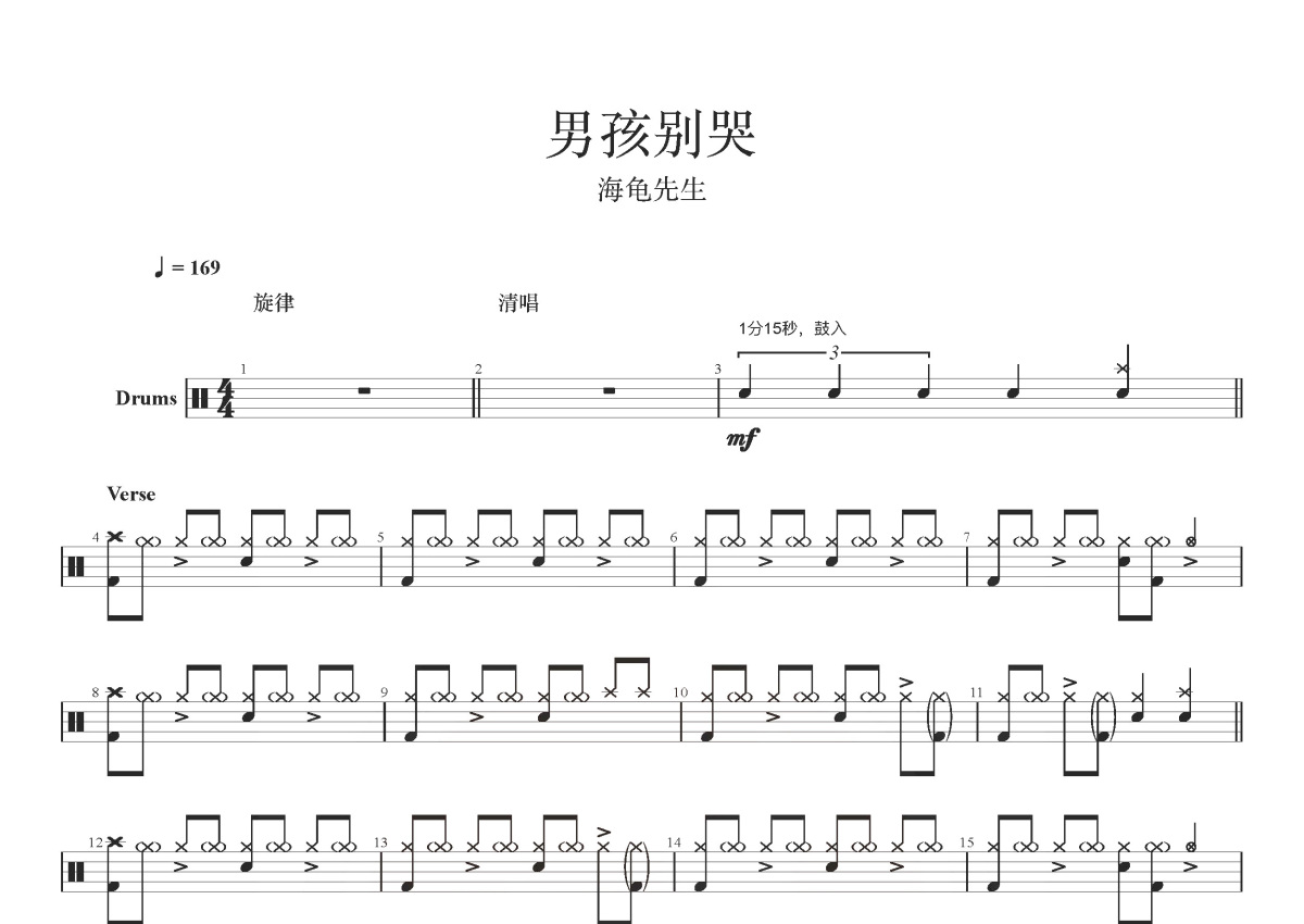 《男孩别哭》是海龟先生演唱的一首歌曲,这份鼓谱共有四张高清图谱,图谱由 @玉帝哥哥 编配上传,图谱使用五线谱编配,使用这份男孩别哭架子鼓谱,你将能够轻松地敲打出这首海龟先生的男孩别哭,快来尝试吧。《男孩别哭》是由李红旗作词、作曲,海龟先生演唱的歌曲,收录于专辑《海龟先生》中。海龟先生,中国内地摇滚乐队,由主唱李红旗、贝斯手蒋晗和吉他手黄巍组成。2004年12月,乐队正式成立。2012年,签约摩登天空,发行同名专辑《海龟先生》。2019年参加原创音乐综艺节目《乐队的夏天》,初赛凭借一首《男孩别哭》获得全场第一名的佳绩。
