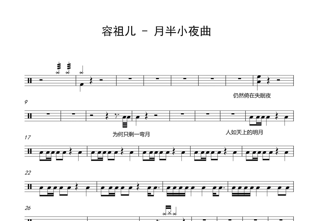 《月半小夜曲》是容祖儿演唱的一首歌曲,容祖儿版,这份鼓谱共有两张高清图谱,图谱由 @玉帝哥哥 编配上传,图谱使用五线谱编配,使用这份月半小夜曲架子鼓谱,你将能够轻松地敲打出这首容祖儿的月半小夜曲,快来尝试吧。香港天后容祖儿于《我是歌手第四季》中演唱歌曲《月半小夜曲》。乐队+大型弦乐团的配置,将歌曲从“大”的方面进行了另一审美层面的展示,大气、大歌、大阵仗,容祖儿除了咬字紧实、断气错落、字字精准地诠释了最新版《月半小夜曲》,还在举手投足之间,示范了一个“演唱者”的自我修养。