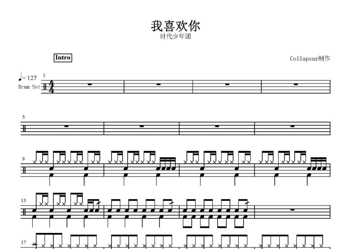 《我喜欢你》是时代少年团演唱的一首歌曲,这份鼓谱共有四张高清图谱,图谱由 @玉帝哥哥 编配上传,图谱使用五线谱编配,使用这份我喜欢你架子鼓谱,你将能够轻松地敲打出这首时代少年团的我喜欢你,快来尝试吧。《我喜欢你》是中国内地男子演唱组合时代少年团演唱的歌曲,由欧中建和司捷作词,欧中建和O'neal作曲,ParkSeokKi和O'neal编曲,司捷担当制作人,于2021年7月26日发布。