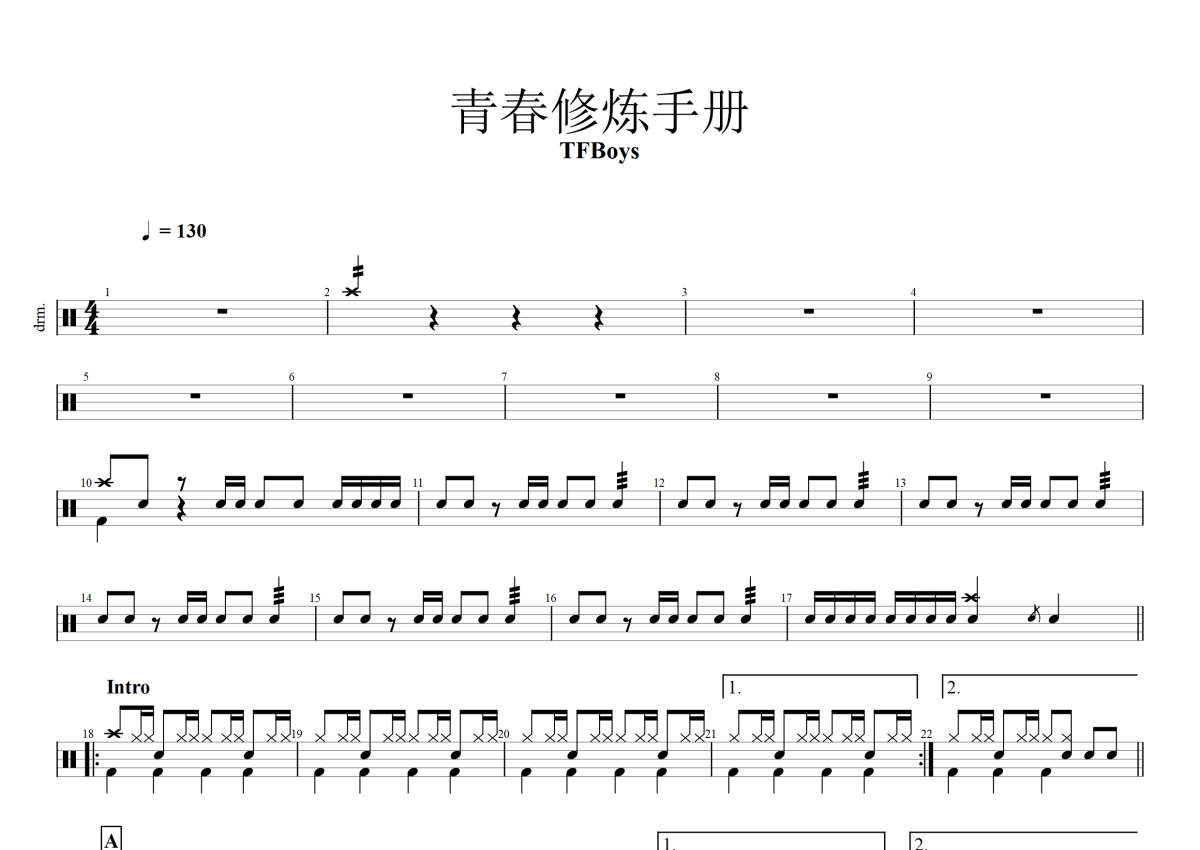 《青春修炼手册》是TFBOYS演唱的一首歌曲,这份鼓谱共有三张高清图谱,图谱由 @玉帝哥哥 编配上传,图谱使用五线谱编配,使用这份青春修炼手册架子鼓谱,你将能够轻松地敲打出这首TFBOYS的青春修炼手册,快来尝试吧。《青春修炼手册》是由TFBOYS演唱的歌曲,由王韵韵作词、刘佳谱曲、永之恒乐队等编曲,该歌曲于2014年7月24日正式发行。歌曲前奏借鉴金莎的歌曲《爱的魔法》。2014年第34期音悦台音悦V榜中该MV本期打破5项V榜吉尼斯;TFBOYS携该歌曲登2014年中央电视台中秋晚会和湖南卫视中秋晚会。2016年2月7日,TFBOYS登上中央电视台春节联欢晚会,表演歌舞节目《快乐成长》,以《青春修炼手册》作为开场和收尾。