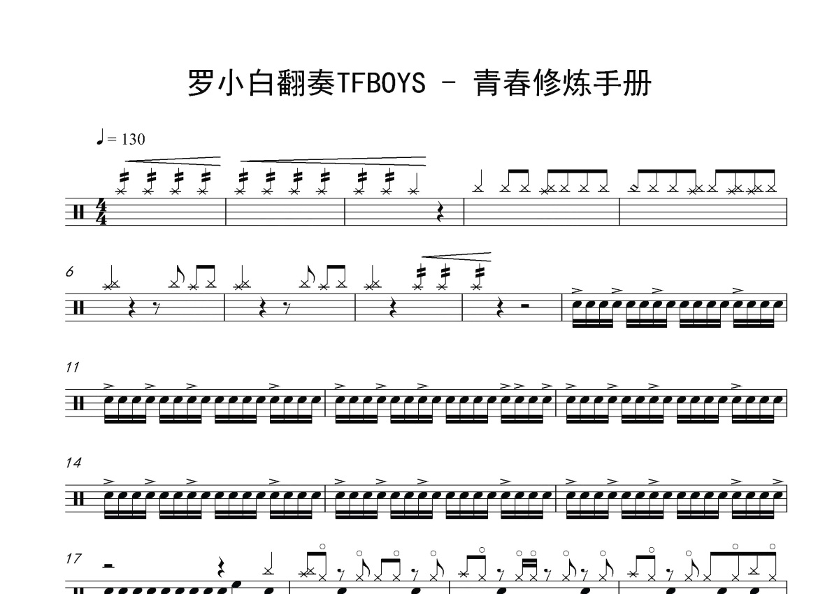 《青春修炼手册》是TFBOYS演唱的一首歌曲,这份鼓谱共有三张高清图谱,图谱由 @玉帝哥哥 编配上传,图谱使用五线谱编配,使用这份青春修炼手册架子鼓谱,你将能够轻松地敲打出这首TFBOYS的青春修炼手册,快来尝试吧。《青春修炼手册》是由TFBOYS演唱的歌曲,由王韵韵作词、刘佳谱曲、永之恒乐队等编曲,该歌曲于2014年7月24日正式发行。歌曲前奏借鉴金莎的歌曲《爱的魔法》。2014年第34期音悦台音悦V榜中该MV本期打破5项V榜吉尼斯[1] ;TFBOYS携该歌曲登2014年中央电视台中秋晚会和湖南卫视中秋晚会。2016年2月7日,TFBOYS登上中央电视台春节联欢晚会,表演歌舞节目《快乐成长》,以《青春修炼手册》作为开场和收尾[2] 。