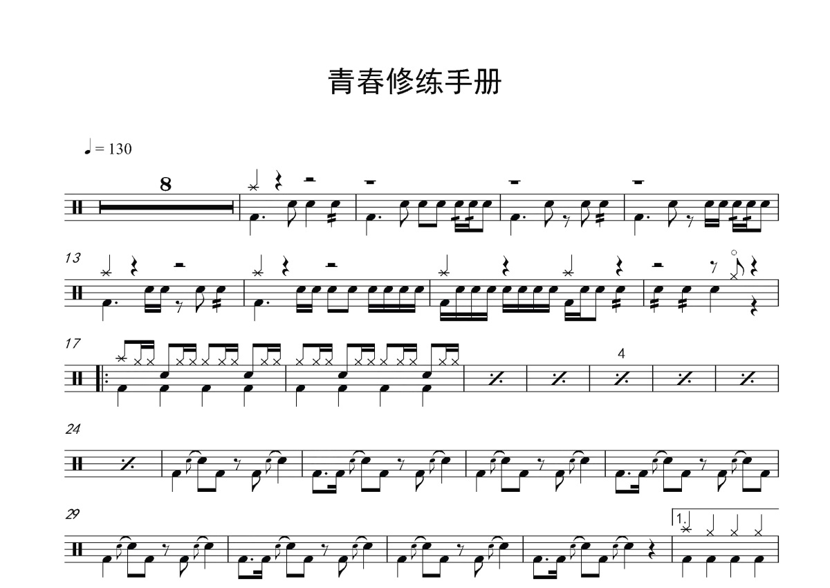 《青春修炼手册》是TFBOYS演唱的一首歌曲,这份鼓谱共有两张高清图谱,图谱由 @玉帝哥哥 编配上传,图谱使用五线谱编配,使用这份青春修炼手册架子鼓谱,你将能够轻松地敲打出这首TFBOYS的青春修炼手册,快来尝试吧。abstract=《青春修炼手册》是由TFBOYS演唱的歌曲,由王韵韵作词、刘佳谱曲、永之恒乐队等编曲,该歌曲于2014年7月24日正式发行。歌曲前奏借鉴金莎的歌曲《爱的魔法》。2014年第34期音悦台音悦V榜中该MV本期打破5项V榜吉尼斯[1] ;TFBOYS携该歌曲登2014年中央电视台中秋晚会和湖南卫视中秋晚会。2016年2月7日,TFBOYS登上中央电视台春节联欢晚会,表演歌舞节目《快乐成长》,以《青春修炼手册》作为开场和收尾[2] 。