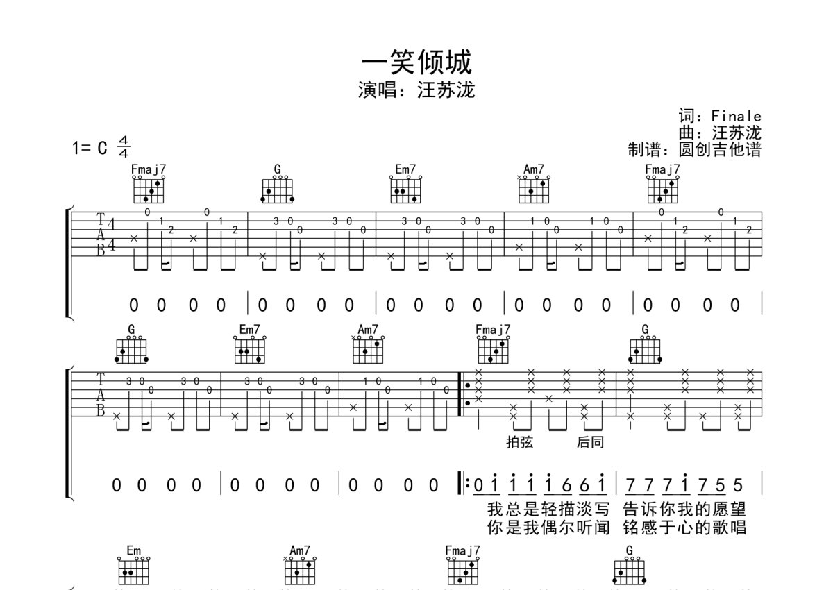 汪苏泷《一曲倾城》吉他谱 - C调弹唱六线谱