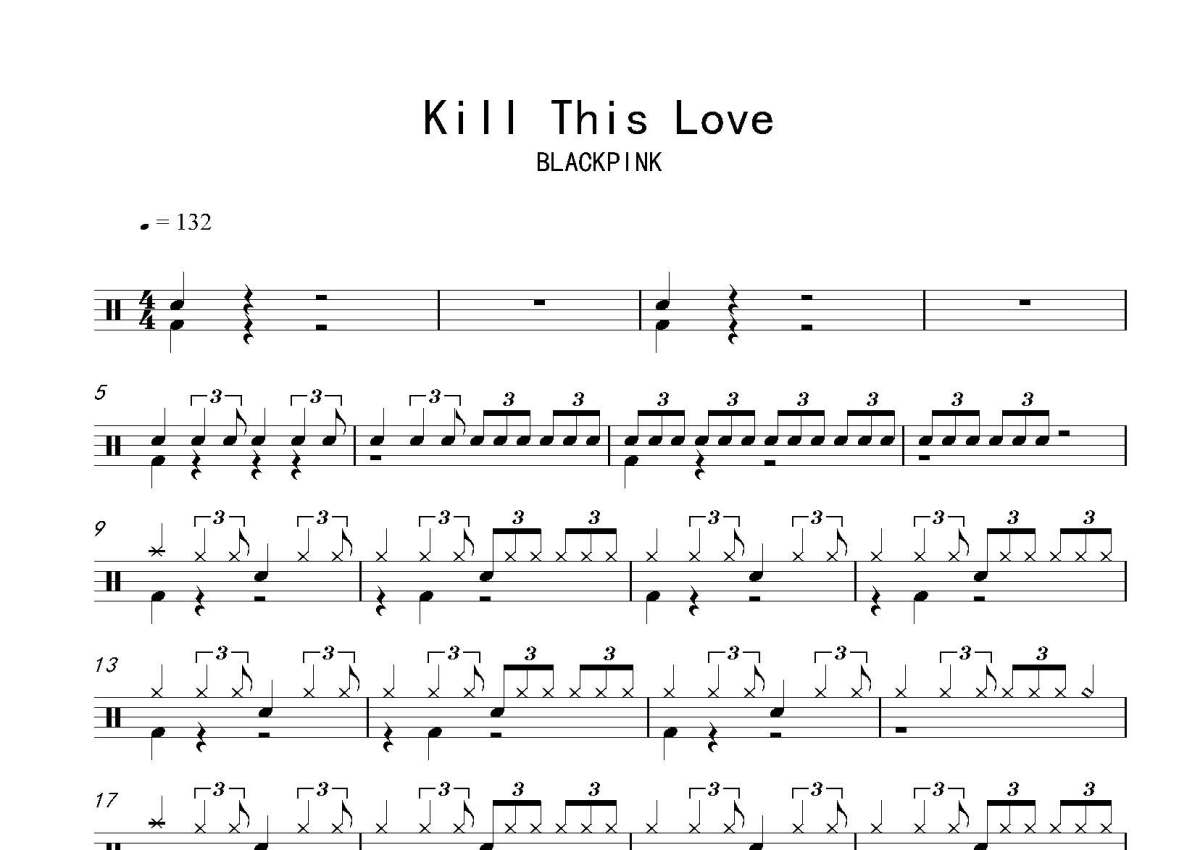 《KILL THIS LOVE》是Blackpink演唱的一首歌曲,这份鼓谱共有三张高清图谱,图谱由 @玉帝哥哥 编配上传,图谱使用五线谱编配,使用这份KILL THIS LOVE架子鼓谱,你将能够轻松地敲打出这首Blackpink的KILL THIS LOVE,快来尝试吧。《KILLTHISLOVE》是由韩国女子演唱组合BLACKPINK于韩国首尔时间2019年4月5日0时发布的第二张迷你音乐专辑,歌曲语言为韩文和英文。专辑收录曲共有5首,分别是KillThisLove、Don’tKnowWhatToDo、KickIt、HopeNot、DDU-DUDDU-DU(Remix)。BLACKPINK(블랙핑크)是YGEntertainment于2016年8月8日推出的韩国女子演唱组合,由金智秀(JISOO)、金智妮(JENNIE)、朴彩英(ROSÉ)、。