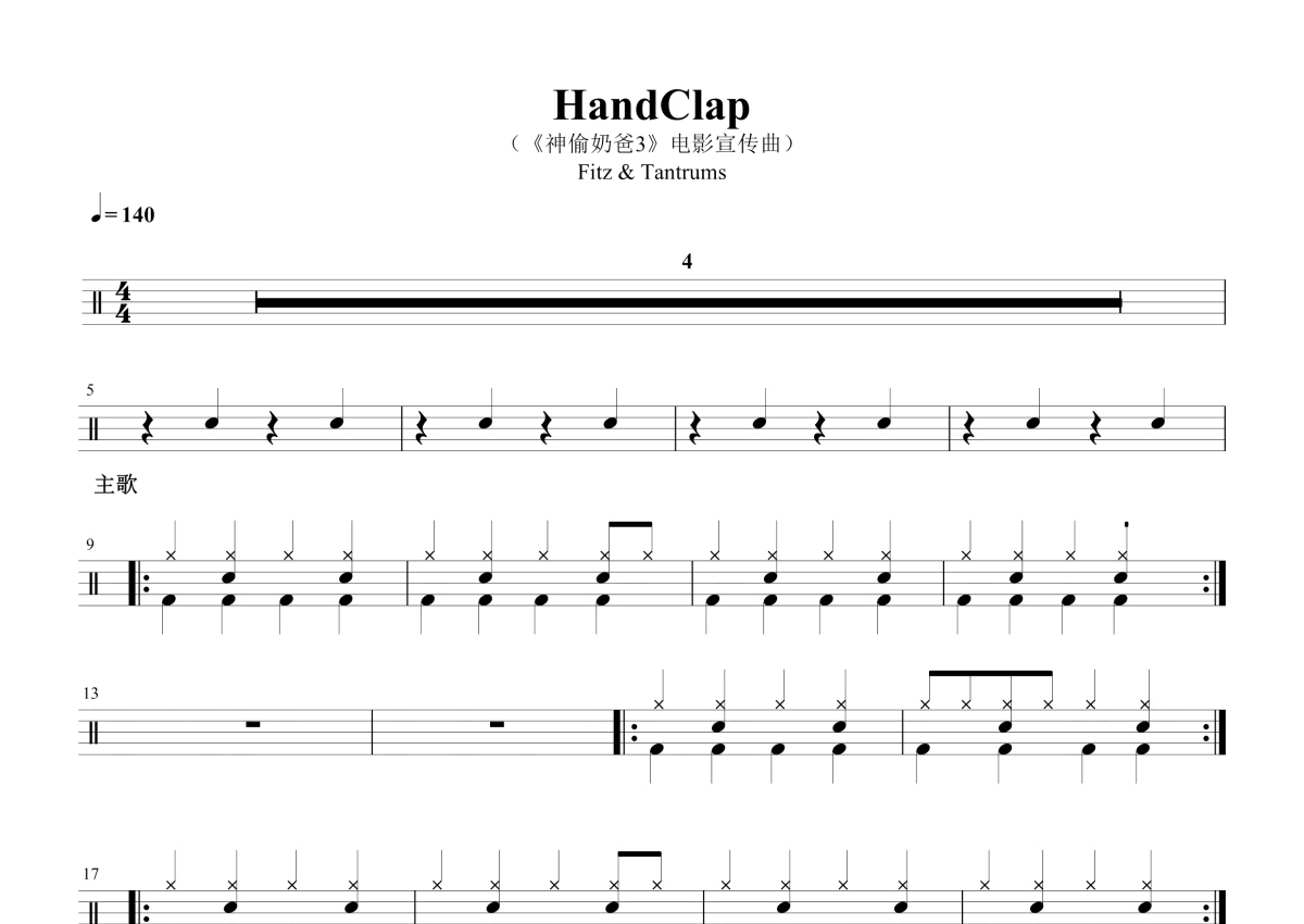 《HandClap(98k)》是Fitz & The Tantrums演唱的一首歌曲,这份鼓谱共有两张高清图谱,图谱由 @玉帝哥哥 编配上传,图谱使用五线谱编配,使用这份HandClap(98k)架子鼓谱,你将能够轻松地敲打出这首Fitz & The Tantrums的HandClap(98k),快来尝试吧。《HandClap》是由JeremyRuzumna、JamesKingEric、Frederic作词作曲,Fitz&TheTantrums演唱的歌曲。该曲收录于Fitz&TheTantrums2016年6月10日发行的专辑《Fitz&theTantrums》中,是《神偷奶爸3》的电影宣传曲。