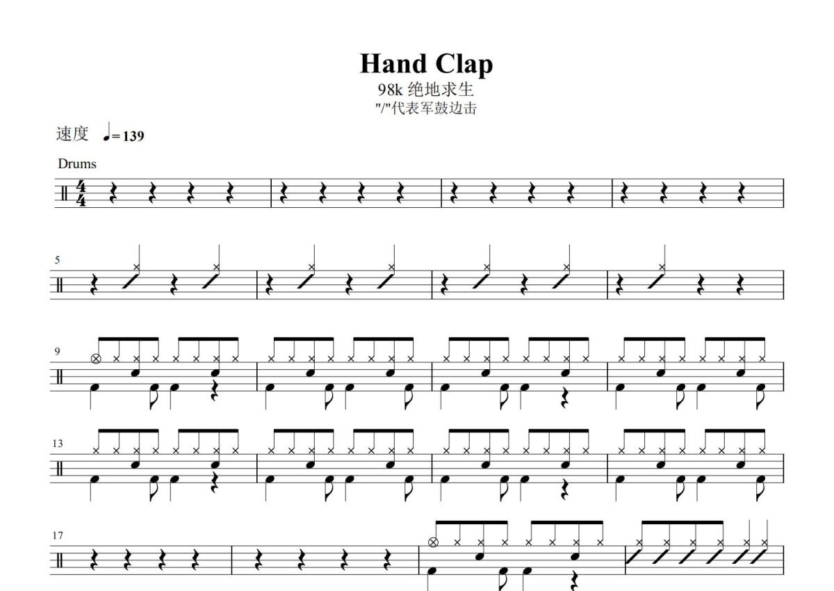 《HandClap(98k)》是Fitz & The Tantrums演唱的一首歌曲,这份鼓谱共有三张高清图谱,图谱由 @玉帝哥哥 编配上传,图谱使用五线谱编配,使用这份HandClap(98k)架子鼓谱,你将能够轻松地敲打出这首Fitz & The Tantrums的HandClap(98k),快来尝试吧。《HandClap》是由JeremyRuzumna、JamesKingEric、Frederic作词作曲,Fitz&TheTantrums演唱的歌曲。该曲收录于Fitz&TheTantrums2016年6月10日发行的专辑《Fitz&theTantrums》中,是《神偷奶爸3》的电影宣传曲。98K吃鸡神曲。
