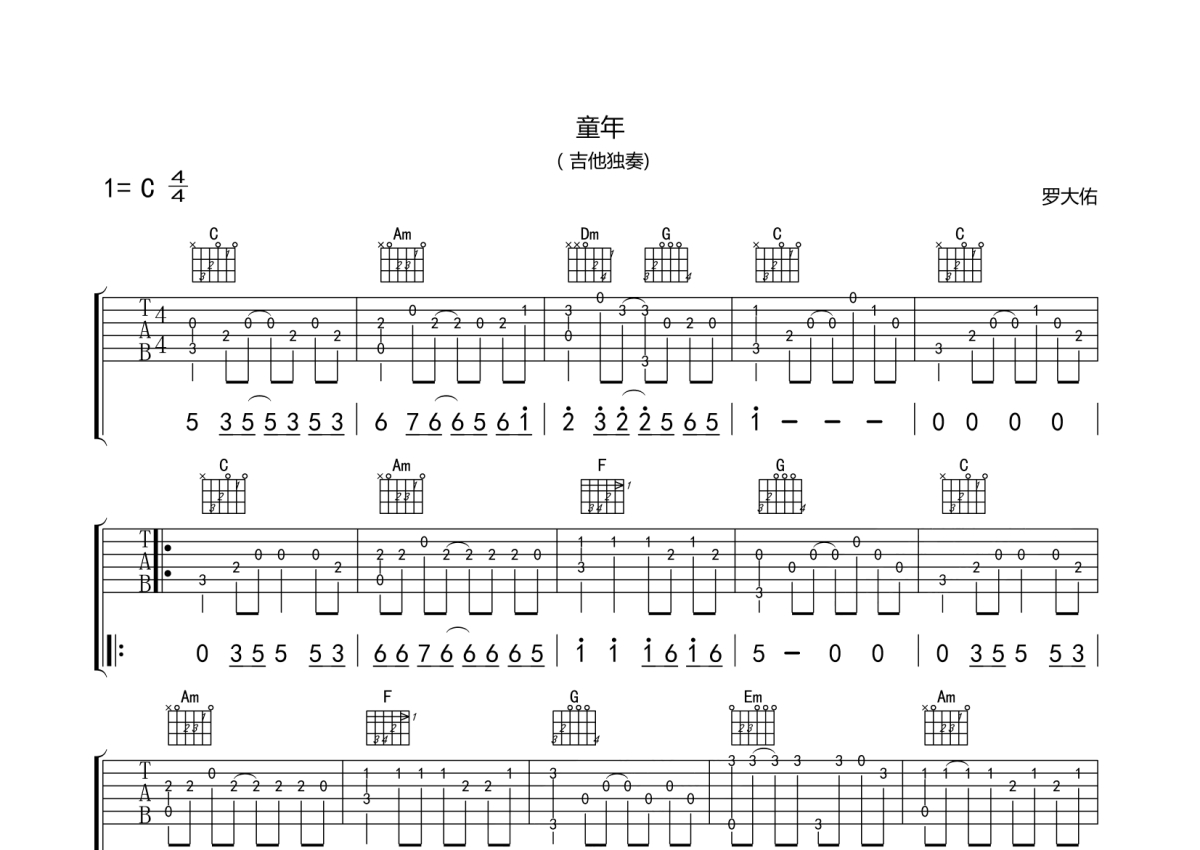 罗大佑《童年》吉他谱 - C调独奏六线谱