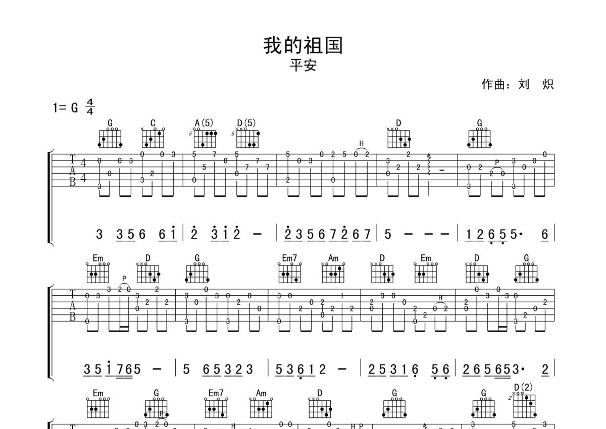 平安《我的祖国》吉他谱 - G调独奏六线谱