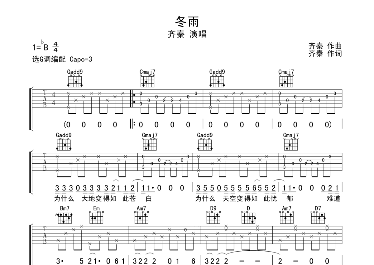 齐秦《冬雨》吉他谱 - G调弹唱六线谱