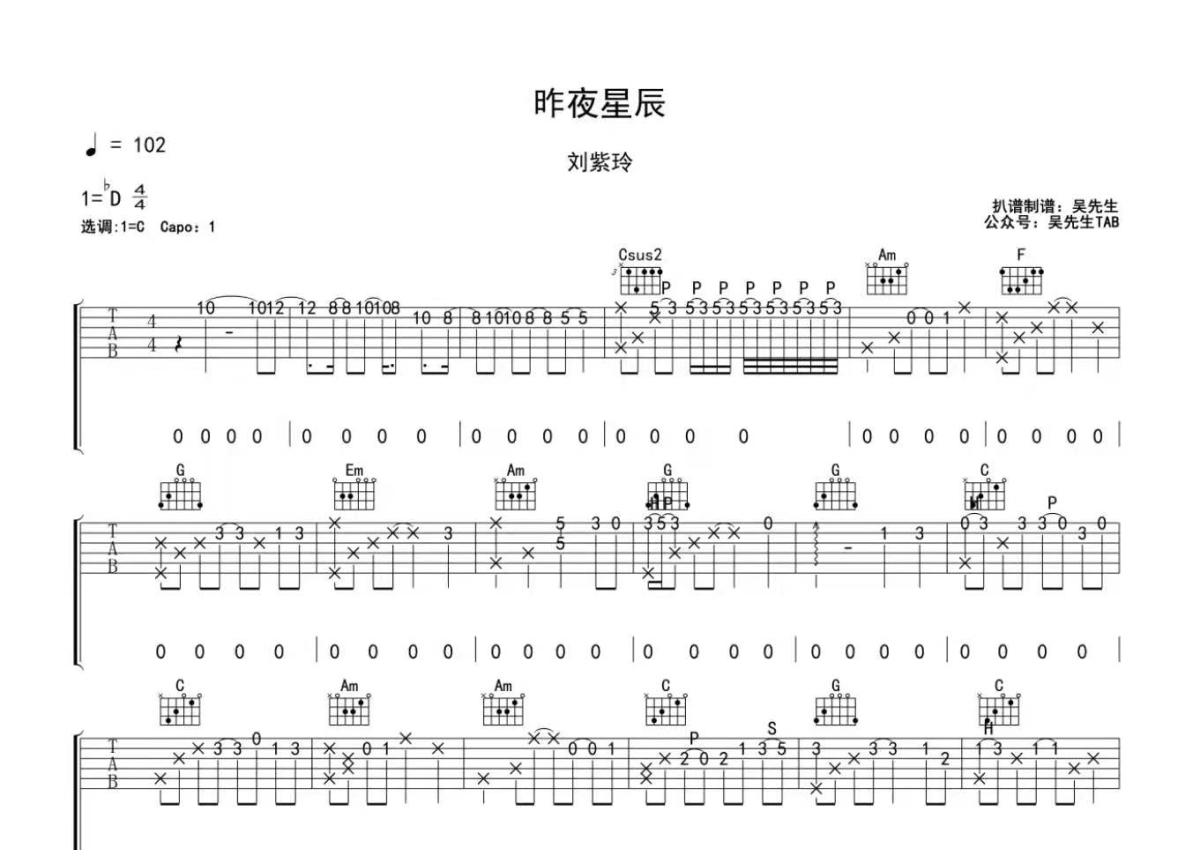 刘紫玲《昨夜星辰》吉他谱 - C调弹唱六线谱