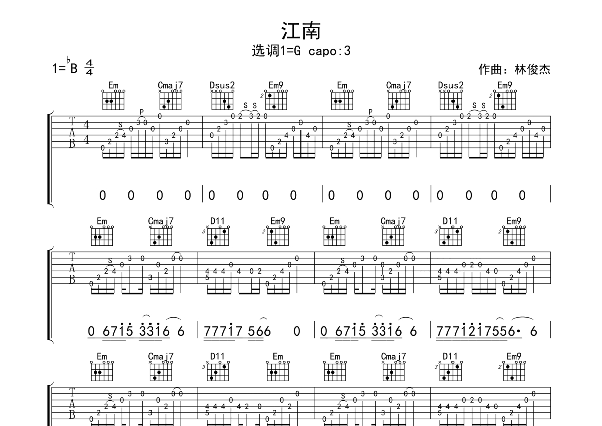 林俊杰《江南》吉他谱 - G调弹唱六线谱