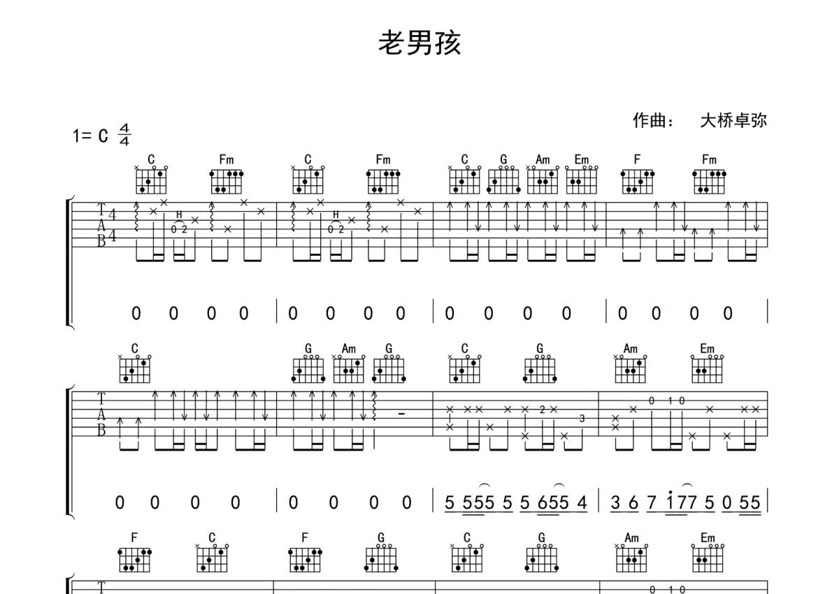 《老男孩》是筷子兄弟演唱的一首歌曲,拍号为4/4拍,歌曲原调为C调,本吉他谱采用的是C调指法编配,演奏时不需要使用变调夹即为原调,这份吉他谱共有两张高清图谱,图谱由 @玉帝哥哥 编配上传,图谱使用六线谱编配,使用这份老男孩吉他谱,可以让你更加方便地掌握这首歌曲的演奏技巧,快来尝试吧。