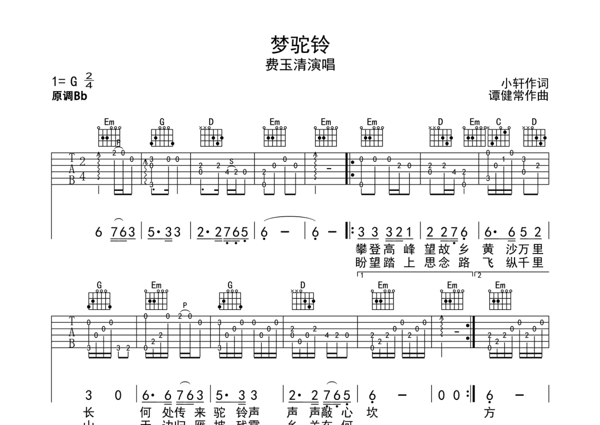 费玉清《梦驼铃》吉他谱 - G调独奏六线谱