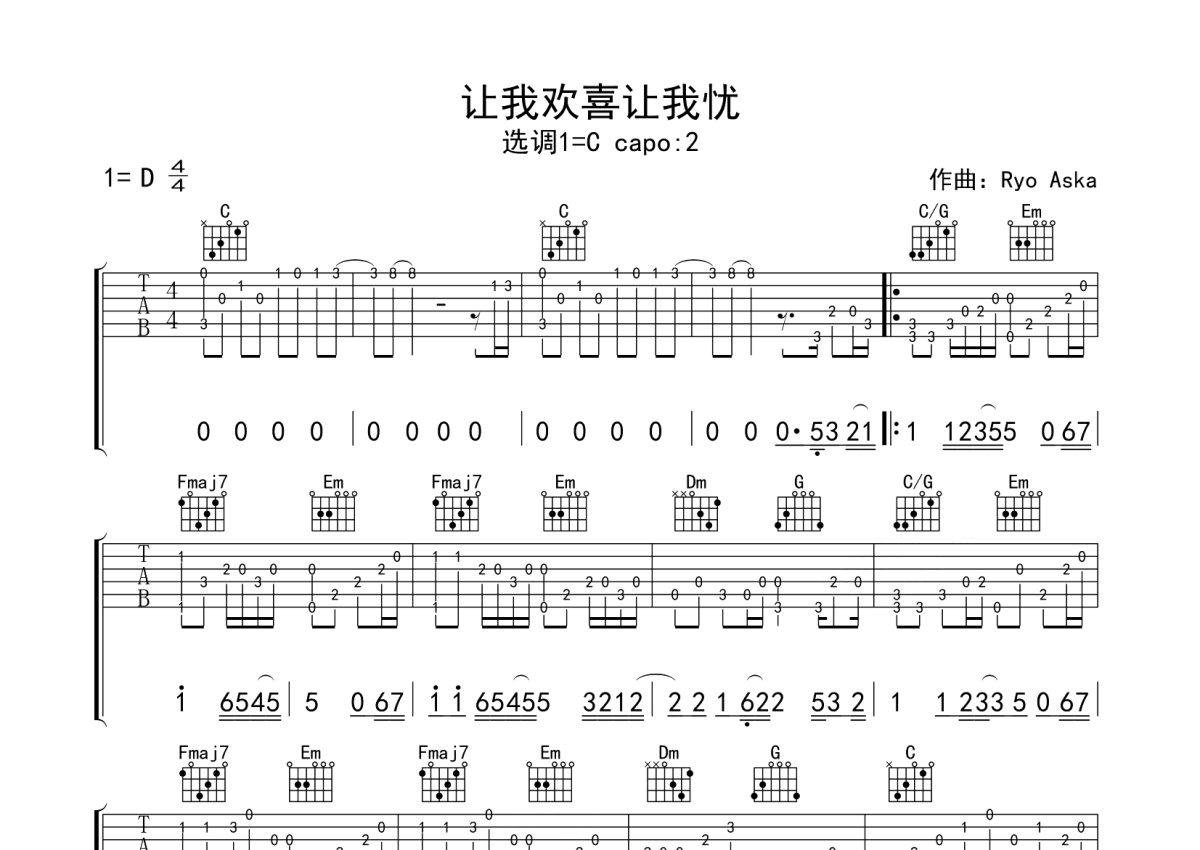 《让我欢喜让我忧》是周华健演唱的一首歌曲,本吉他谱采用的是C调指法编配,这份吉他谱共有两张高清图谱,图谱由 @玉帝哥哥 编配上传,图谱使用六线谱编配,使用这份让我欢喜让我忧吉他谱,可以让你更加方便地掌握这首歌曲的演奏技巧,快来尝试吧。周华健《让我欢喜让我忧》吉他谱_C调吉他独奏谱。