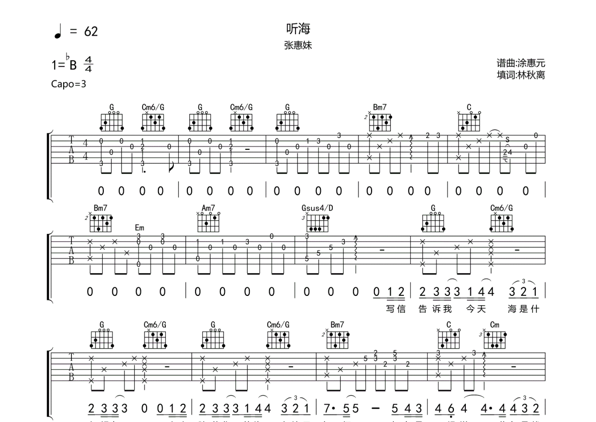 张惠妹《听海》吉他谱 - G调弹唱六线谱