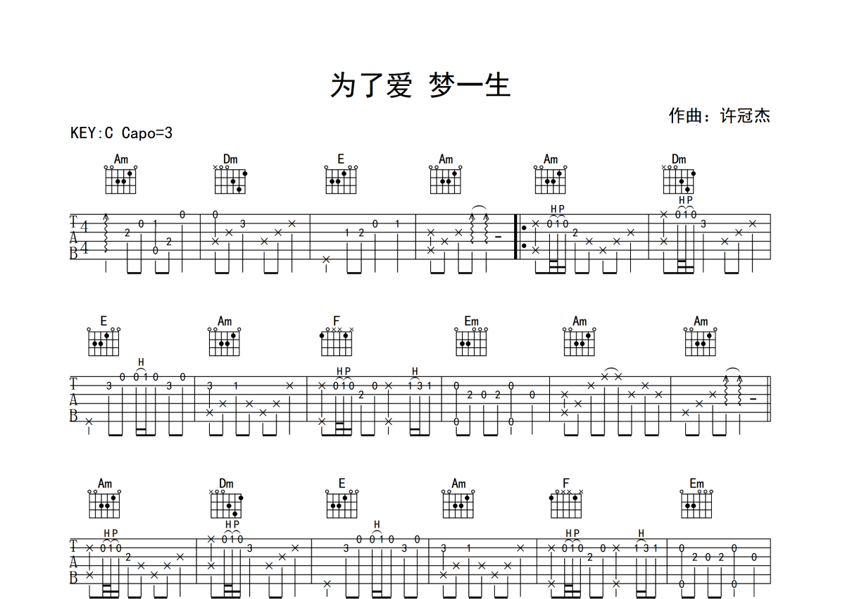 许冠杰《为了爱 梦一生》吉他谱 - C调独奏六线谱
