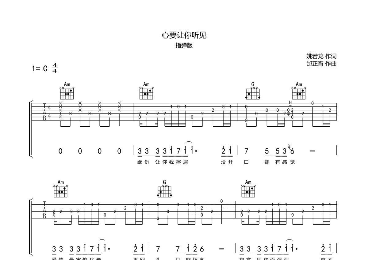 《心要让你听见》是小阿枫演唱的一首歌曲,本吉他谱采用的是C调指法编配,这份吉他谱共有两张高清图谱,图谱由 @玉帝哥哥 编配上传,图谱使用六线谱编配,使用这份心要让你听见吉他谱,可以让你更加方便地掌握这首歌曲的演奏技巧,快来尝试吧。小阿枫《心要让你听见》吉他谱_C调吉他独奏谱。