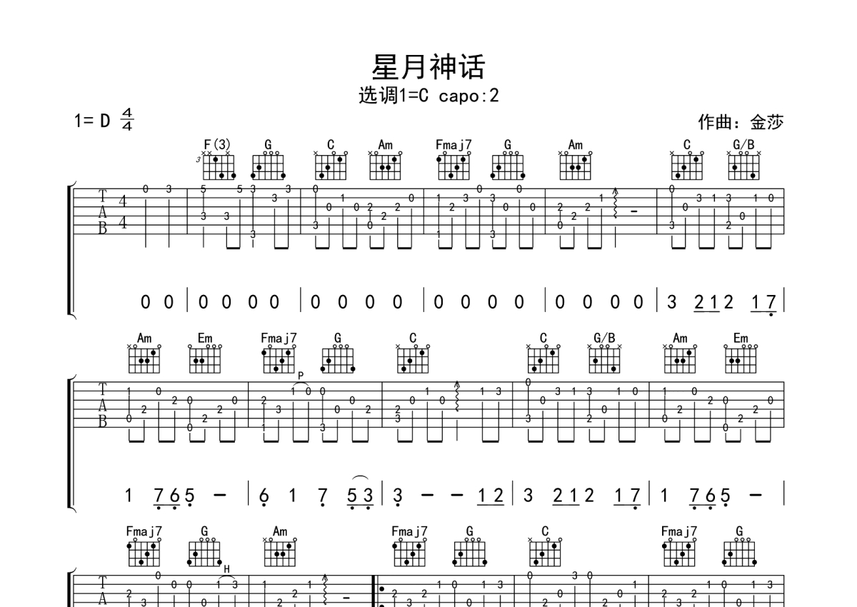 金莎《星月神话》吉他谱 - C调独奏六线谱