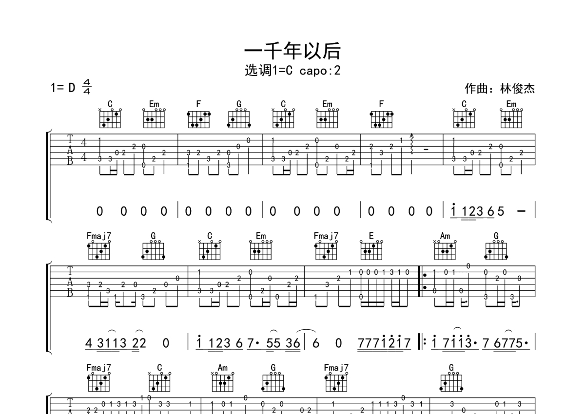 林俊杰《一千年以后》吉他谱 - C调独奏六线谱
