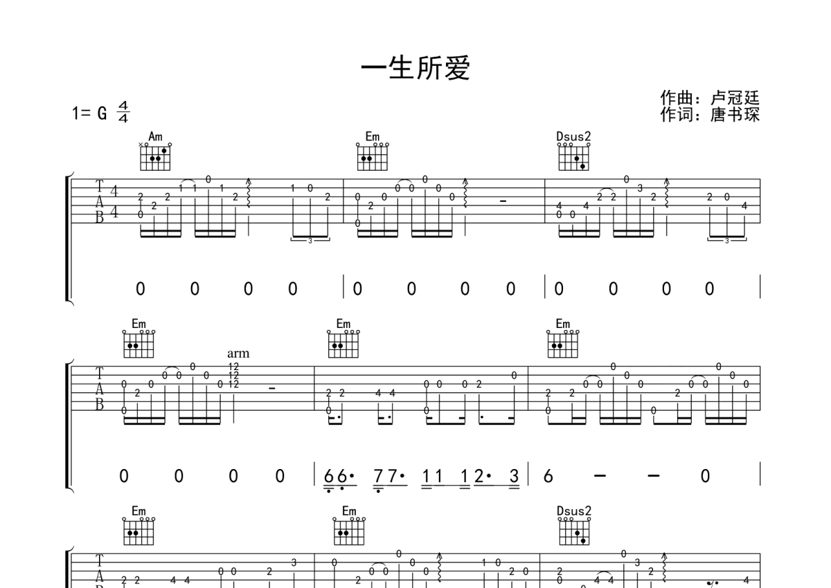 卢冠廷《一生所爱》吉他谱 - G调独奏六线谱