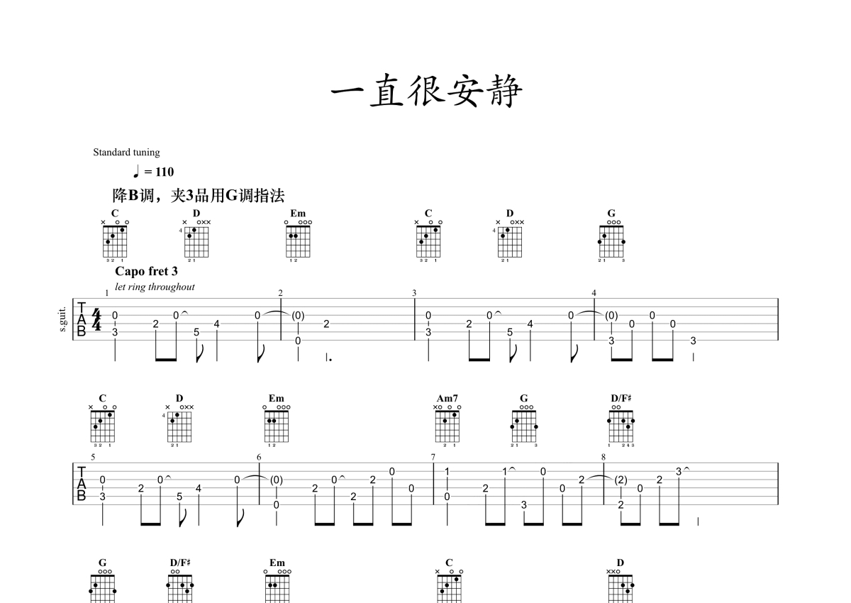 阿桑《一直很安静》吉他谱 - G调独奏六线谱