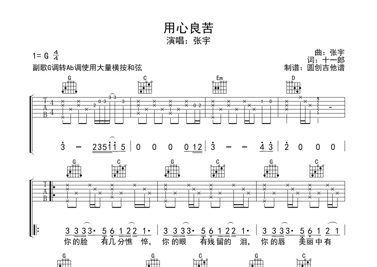 张宇《用心良苦》吉他谱 - G调弹唱六线谱 - 分解加扫弦编配原版编配