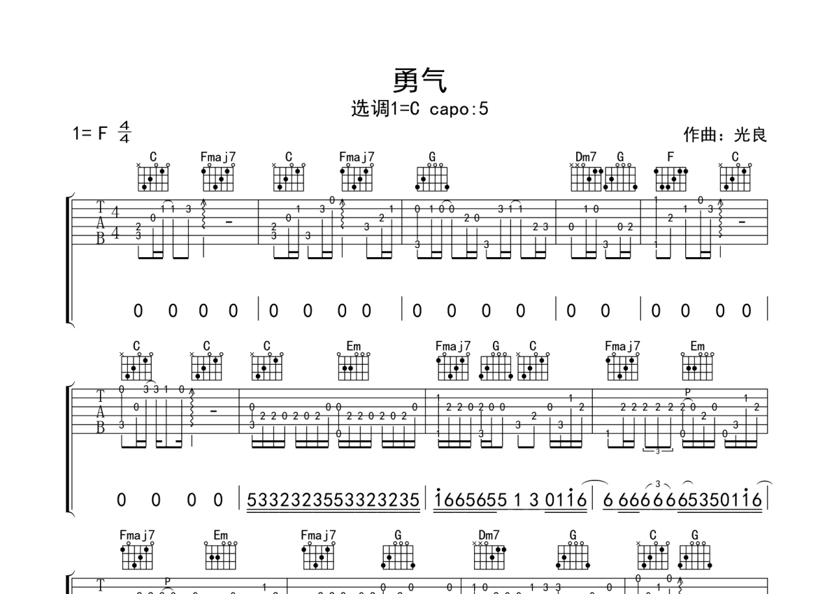 《勇气》是梁静茹演唱的一首歌曲,本吉他谱采用的是C调指法编配,这份吉他谱共有两张高清图谱,图谱由 @玉帝哥哥 编配上传,图谱使用六线谱编配,使用这份勇气吉他谱,可以让你更加方便地掌握这首歌曲的演奏技巧,快来尝试吧。梁静茹《勇气》吉他谱_C调吉他独奏谱。