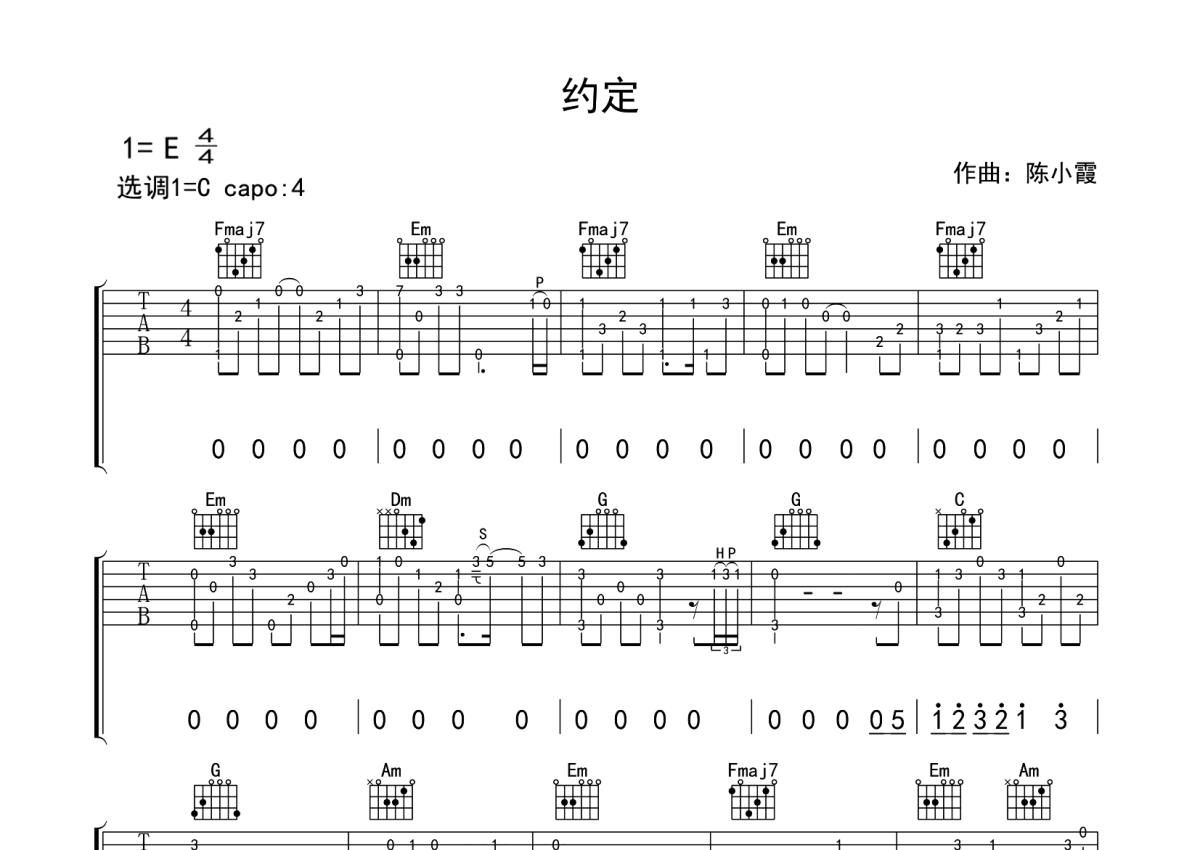 王菲《约定》吉他谱 - C调独奏六线谱