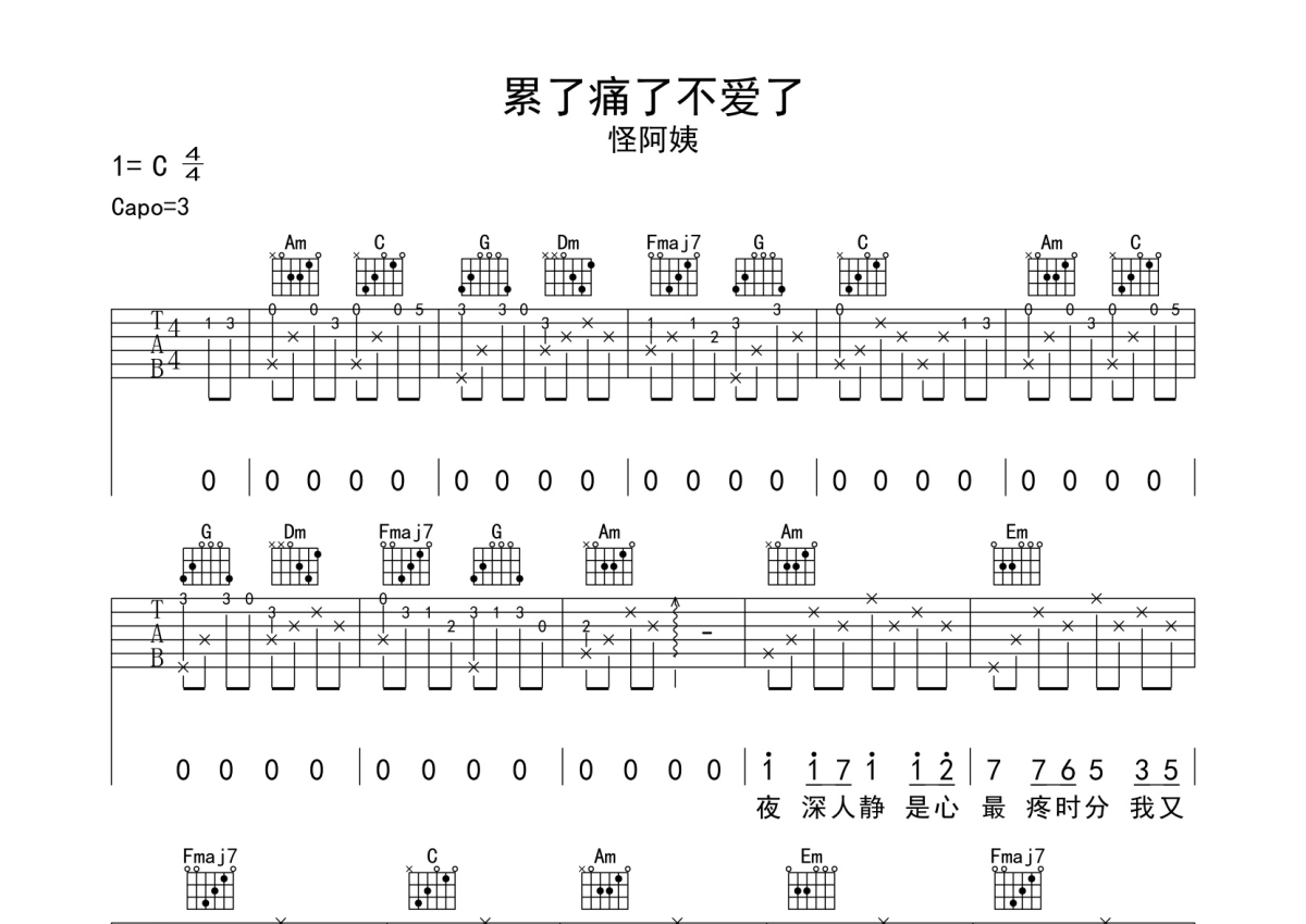 怪阿姨《累了痛了不爱了》吉他谱 - C调弹唱六线谱