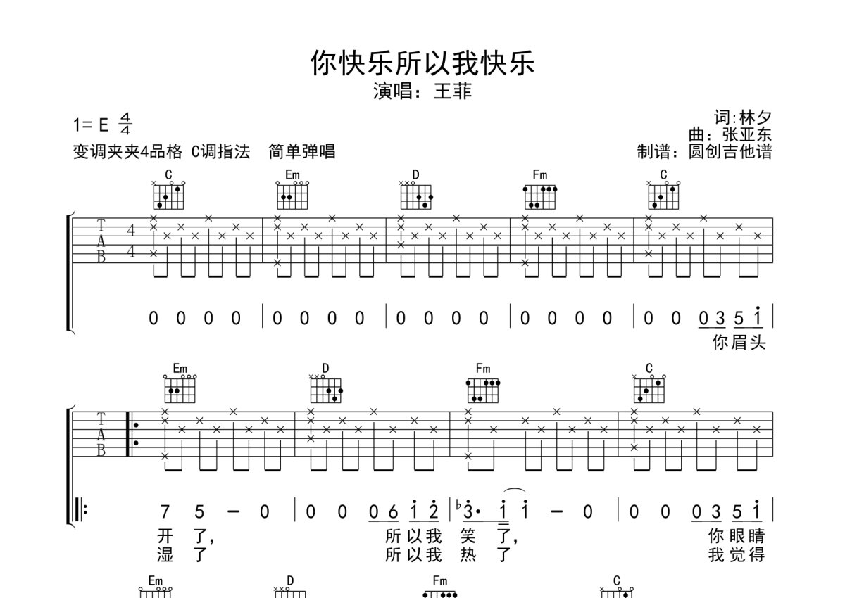 王菲《你快乐所以我快乐》吉他谱 - C调弹唱六线谱 - 分解节奏型简单编配