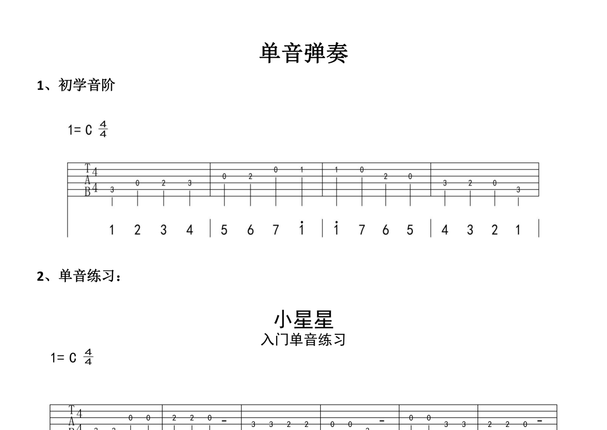 《单音练习曲目》是吉他入门教程演唱的一首歌曲,这份吉他教程谱共有两张高清图谱,图谱由 @玉帝哥哥 编配上传收录了 音阶、小星星、四季歌、多年以前!。