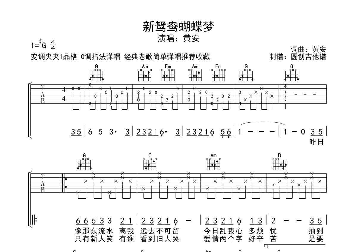 黄安《新鸳鸯蝴蝶梦》吉他谱 - G调弹唱六线谱