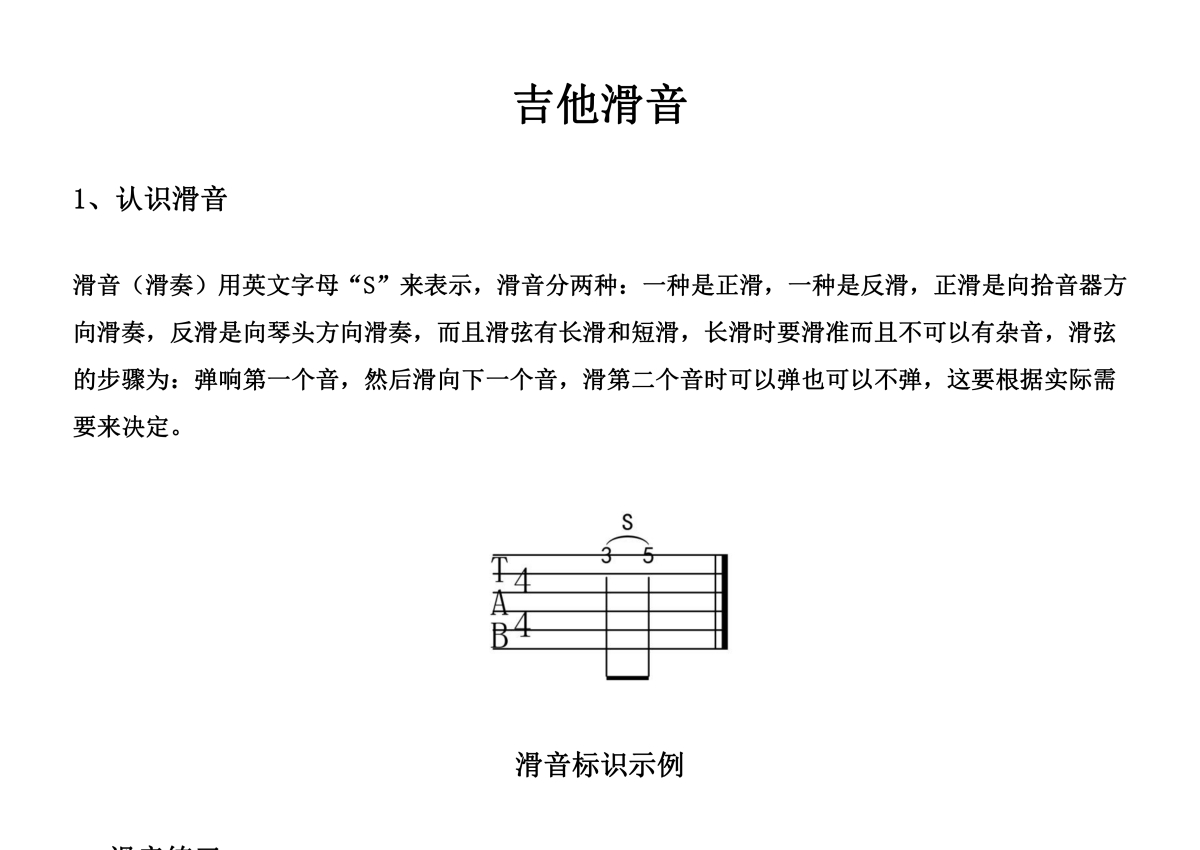 《吉他滑音》是打谱啦吉他基础教程演唱的一首歌曲,这份吉他教程谱共有一张高清图谱,图谱由 @玉帝哥哥 编配上传 滑音—吉他技巧 滑音用英文字母“S”来表示,滑音分两种:一种是正滑,一种是反滑,正滑是向拾音器方向滑奏,反滑是向琴头方向滑奏,而且滑弦有长滑和短滑,长滑时要滑准而且不可以有杂音,滑弦的步骤为:弹响第一个音,然后滑向下一个音,滑第二个音时可以弹也可以不弹,这要根据实际需要来决定。 。