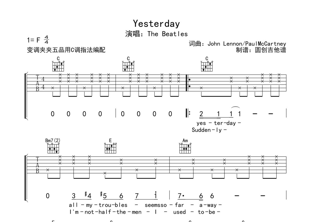 The Beatles《Yesterday》吉他谱 - C调弹唱六线谱