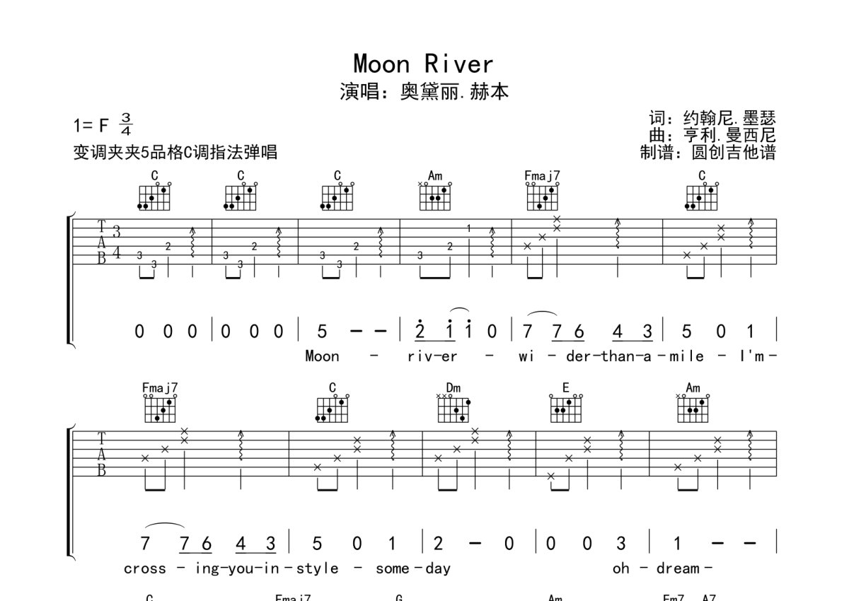 奥黛丽.赫本《Moon River》吉他谱 - C调弹唱六线谱