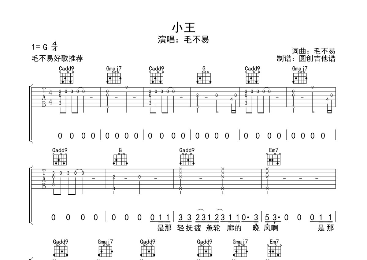 《小王》是毛不易演唱的一首歌曲,分解加扫弦编配原版编配,本吉他谱采用的是G调指法编配,这份吉他谱共有四张高清图谱,图谱由 @圆创吉他谱 编配上传,图谱使用六线谱编配,包含吉他和弦指法、简谱以及歌词部分,曲谱配备了相关的音频提供试听,使用这份小王吉他谱,可以让你更加方便地掌握这首歌曲的弹唱技巧,快来尝试吧。