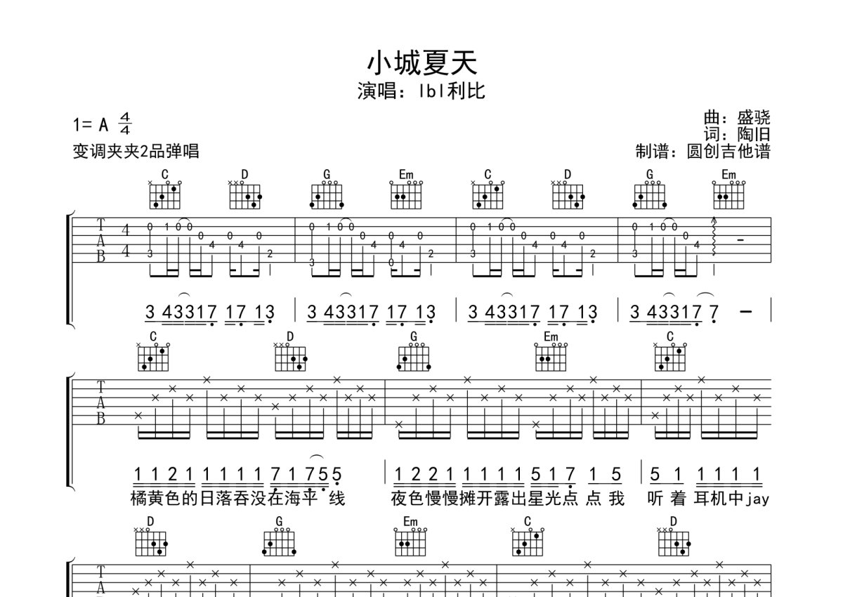 利比《小城夏天》吉他谱 - G调弹唱六线谱 - 分解加扫弦编配原版编配