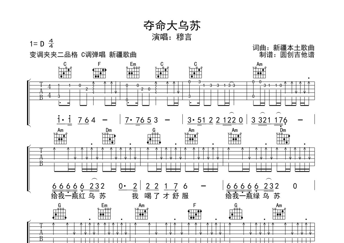 穆言《夺命大乌苏》吉他谱 - C调弹唱六线谱 - 扫弦编配原版编配